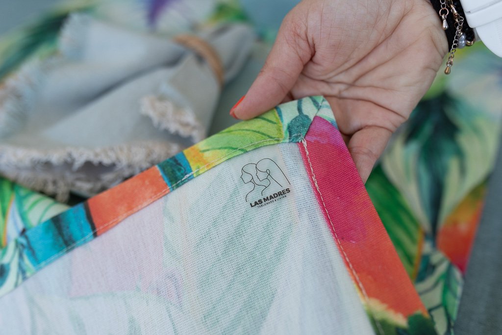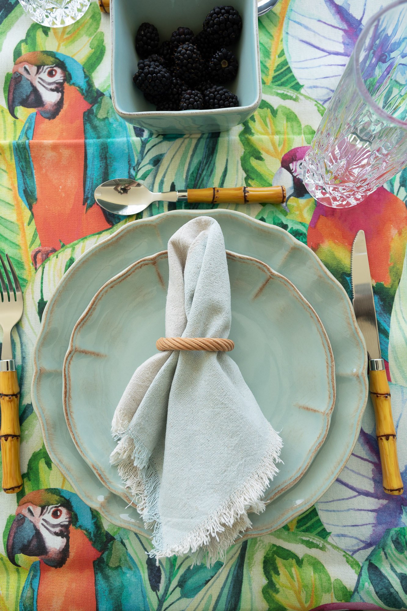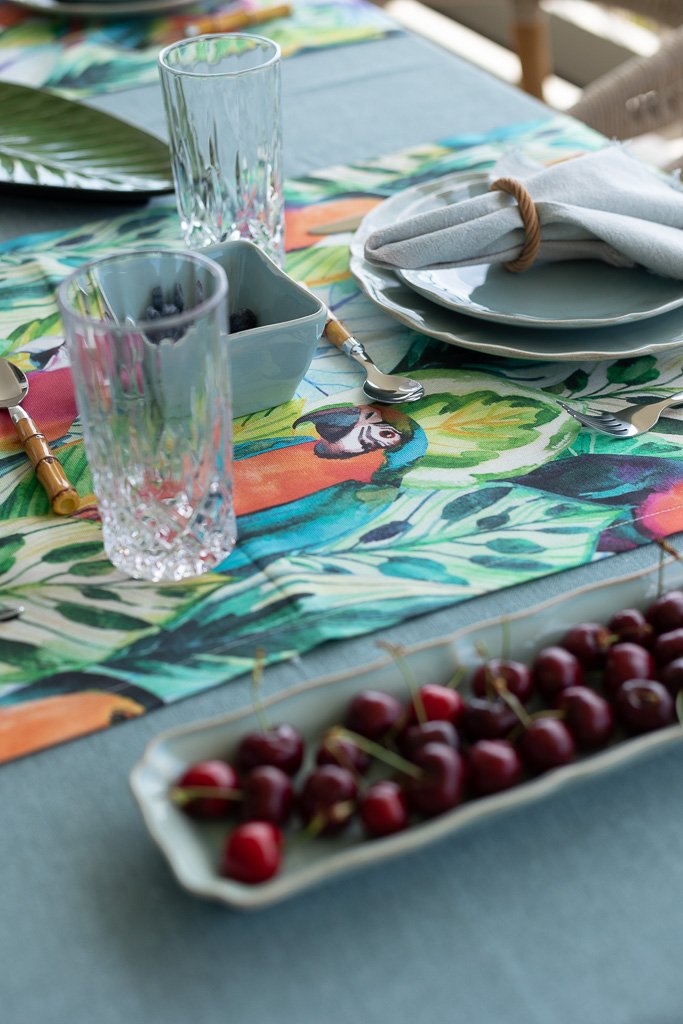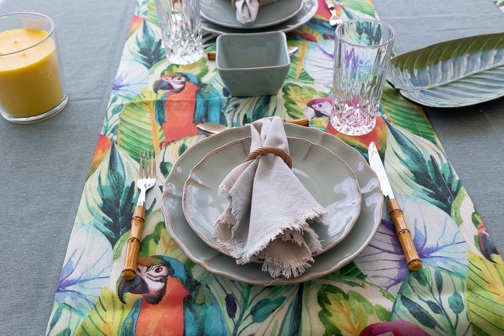 Caminho para mesa da Coleção de Verão 2025 – Salvador, com estampado de araras, pelicanos e plantas tropicais em tons de laranja, azul, verde e amarelo.
