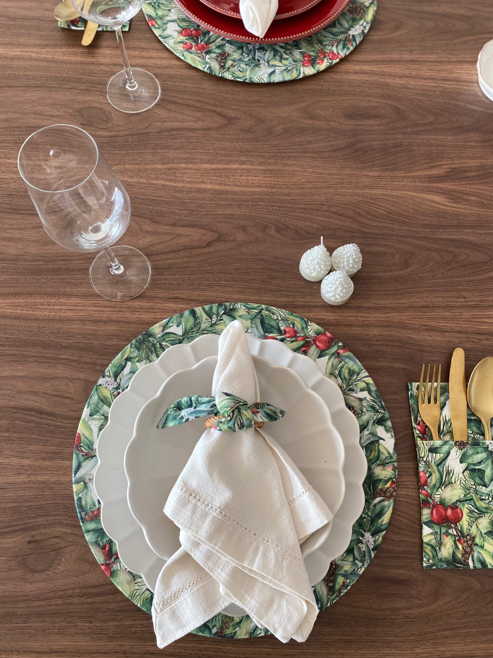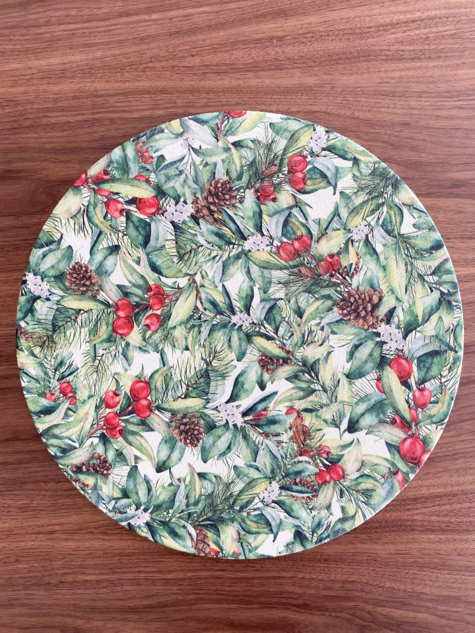 Capa para individual circular com diâmetro de 35 cm da Coleção Lapónia, com estampado de azevinhos em tons de vermelho e verde, com fundo em bege.