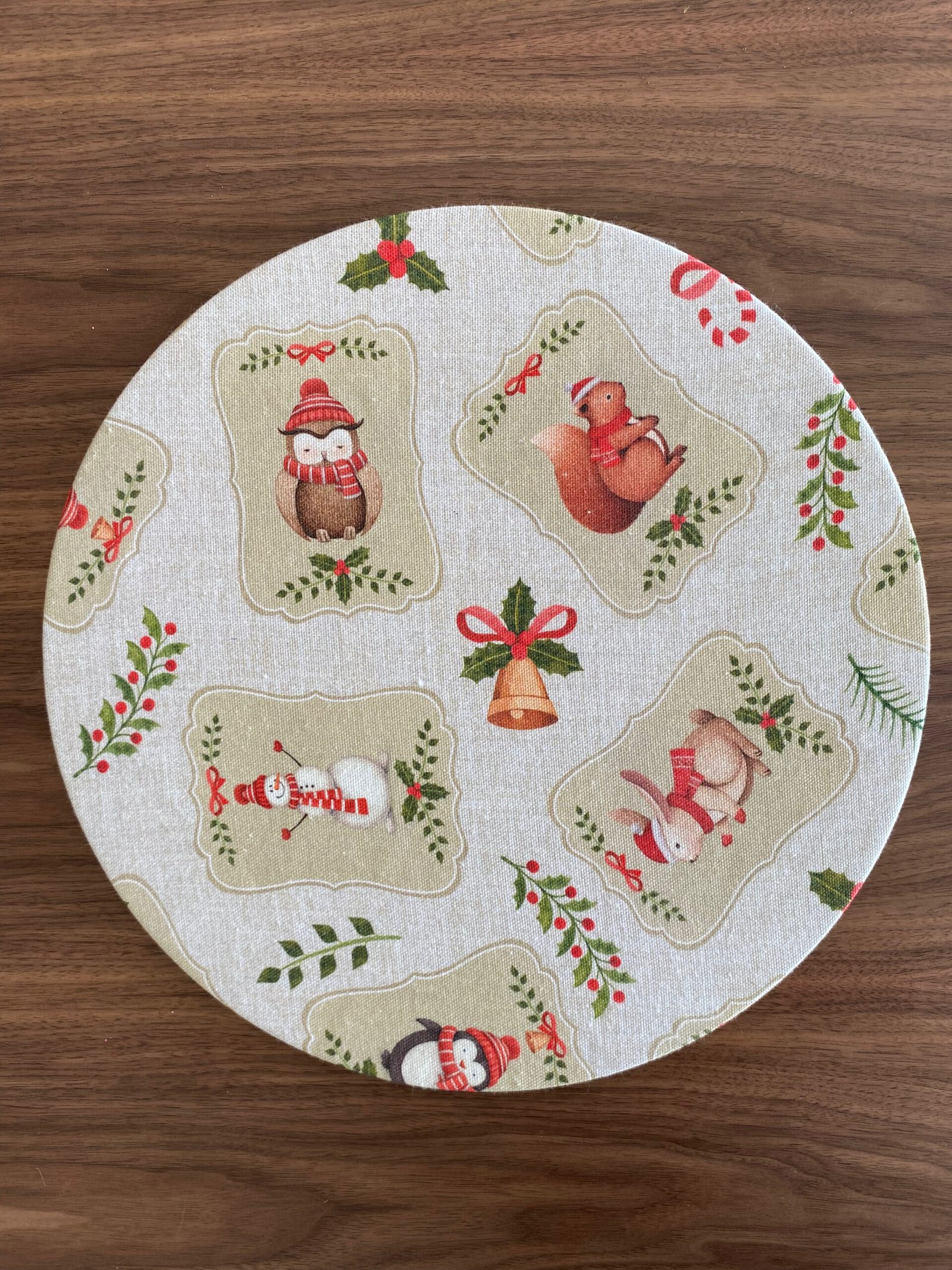 Capa para individual circular com diâmetro de 35 cm da Coleção Lapónia KIDS, com fundo bege e motivos natalícios com animais.