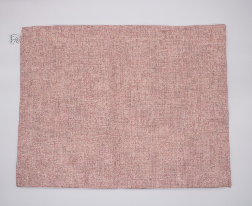 Um dos lados é estampado e o verso é liso rosa em tecido resinado, resistente a manchas.