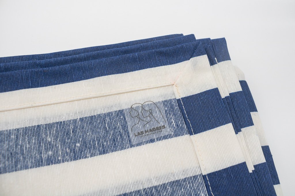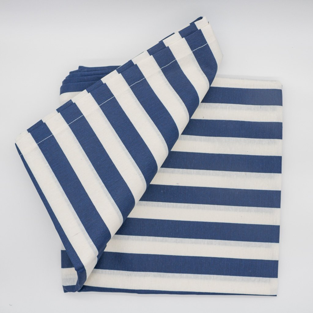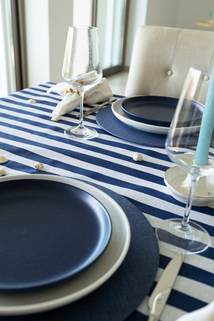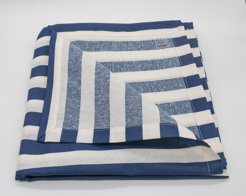 Toalha de mesa da Coleção de Verão 2025 – Santorini, com riscas azuis escuras, em tecido resinado, resistente a manchas.